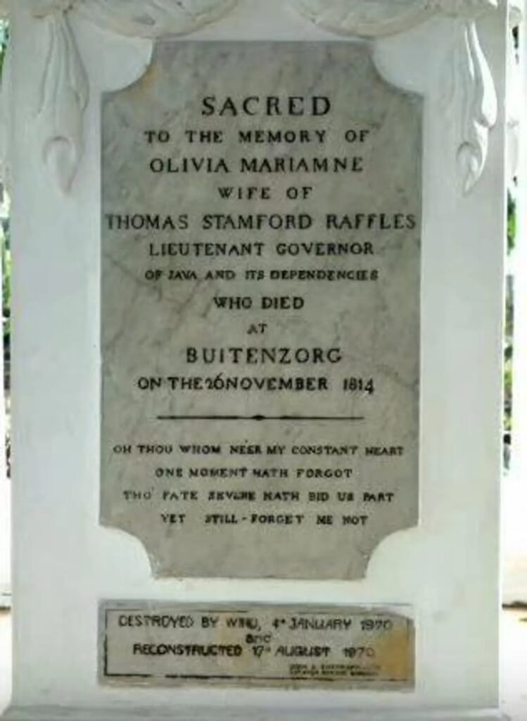 Kisah kasih Raffles dan Olivia berakhir tragis tahun 1814, karena Olivia meninggal dunia akibat penyakit malaria di usia 43 tahun. Sebagai tanda cinta, Raffles lalu membangun monumen untuk Olivia yang dinamakan Tugu Lady Raffles.